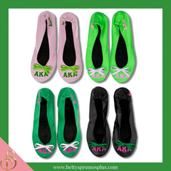 Step into comfort and style with the Delta Sigma Theta ΔΣΘ Printed Foldable Ballet Flats. Available in vibrant red or classic black, these ballet flats feature the iconic ΔΣΘ Greek letters elegantly printed on both shoes, making a bold statement wherever you go. The contrast color bow adds a touch of flair, ensuring these shoes stand out in any setting.