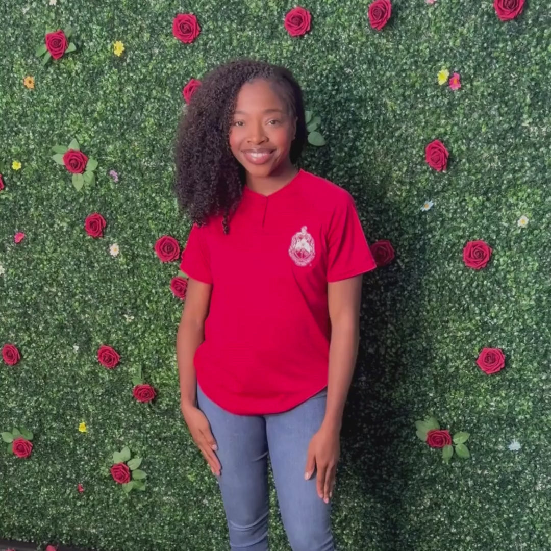 Rock that effortless DST energy with this Delta Sigma Theta Henley. This isn’t your basic red top—this jersey is designed to keep up with your moves, whether you’re heading to chapter meeting, community service, or just repping your letters around town. The embroidered Delta Sigma Theta shield on the left chest gives it that sharp, no-nonsense detail every Soror respects. It's stitched—not printed—so the quality speaks before you even do.