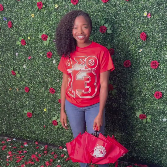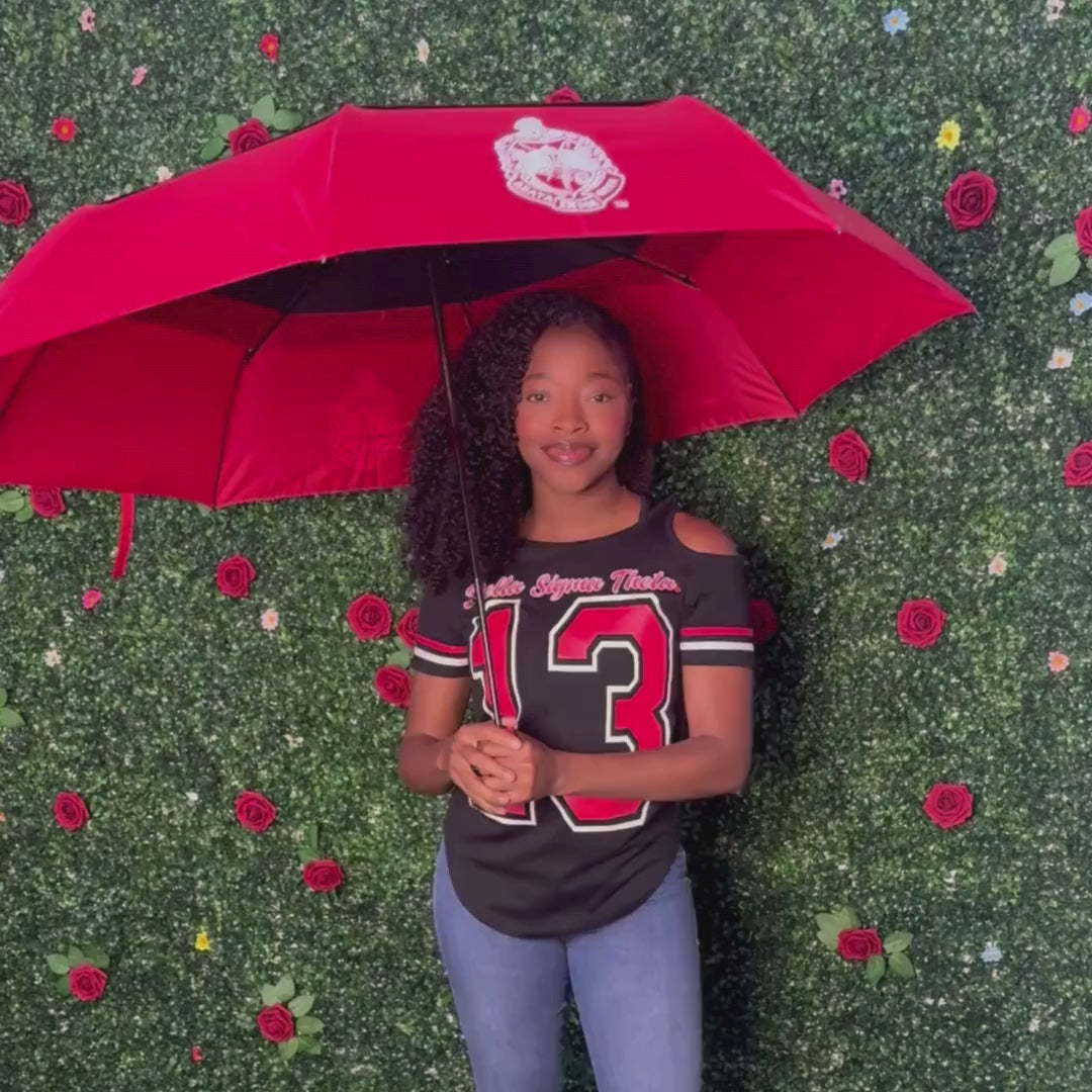 Our Delta Sigma Theta umbrella isn’t just practical; it reflects your connection to Delta Sigma Theta. Available in classic white or black, both options feature striking red accents and proudly display the Delta Sigma Theta shield. The included cover makes storage a breeze, keeping your umbrella safe and ready for use whenever you need it.