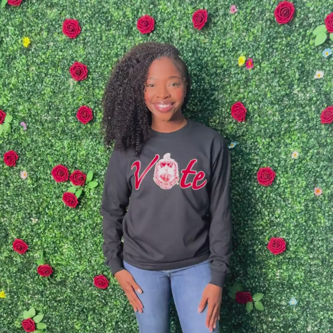 Embrace your Delta Sigma Theta spirit and make a bold statement with our exclusive ΔΣΘ Vote T-Shirt! Designed specifically for the dynamic women of Delta Sigma Theta Sorority, Inc., this shirt is more than just attire—it's a call to action. Crafted with a unique screen-printed design that cleverly integrates the iconic Delta Sigma Theta shield into the word "VOTE," this piece is not just a garment but a powerful message. Available in sleek black, it offers both style and substance.