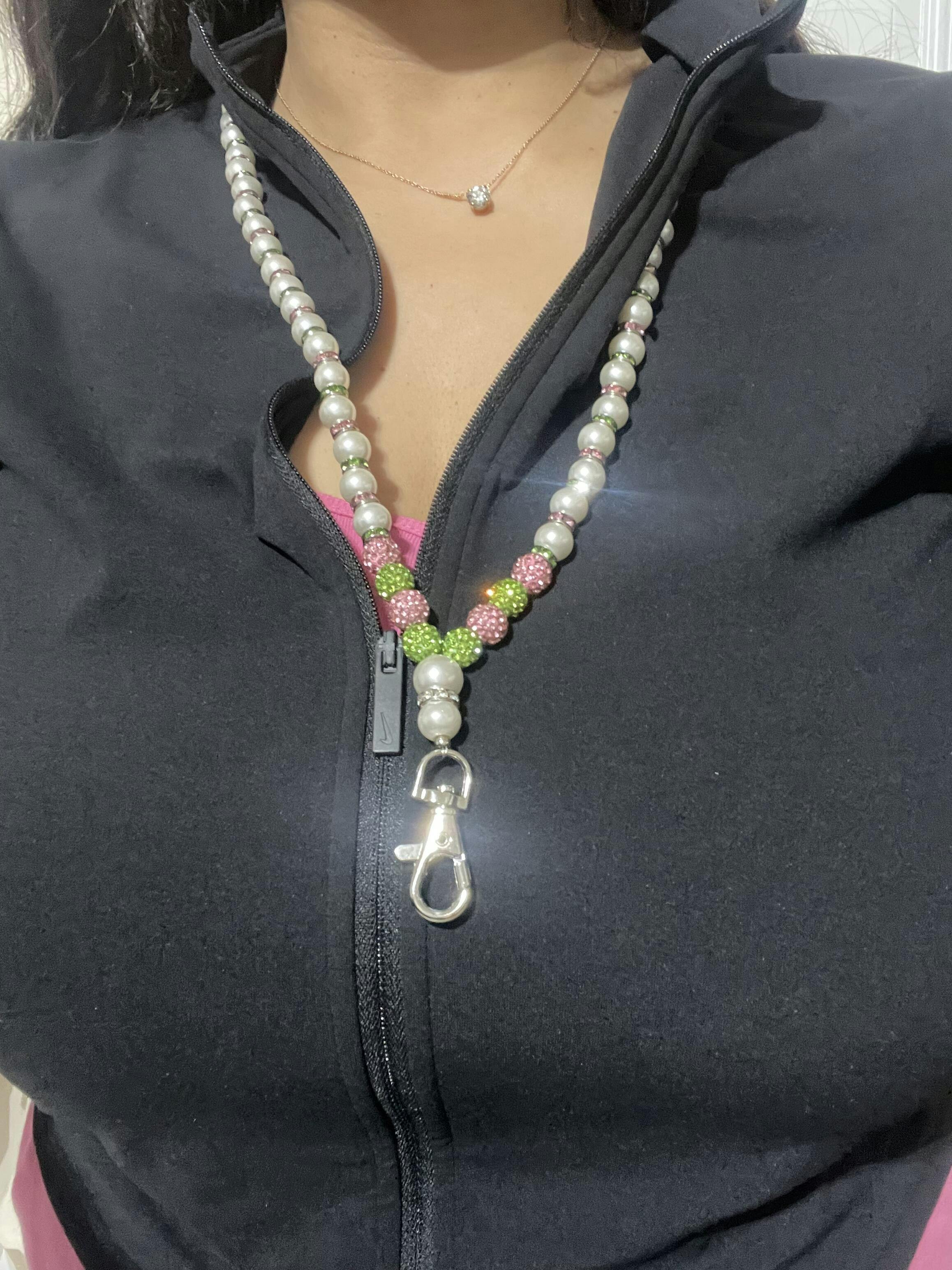 Elevate your Zeta Phi Beta style with our Pearl Lanyard. Order yours today and let the world see your sorority pride shine through! You might also like our matching Zeta Phi Beta Pearl Necklace with Rhinestone Spacers and our Zeta Phi Beta Pearl Bracelet with Rhinestone Spacers